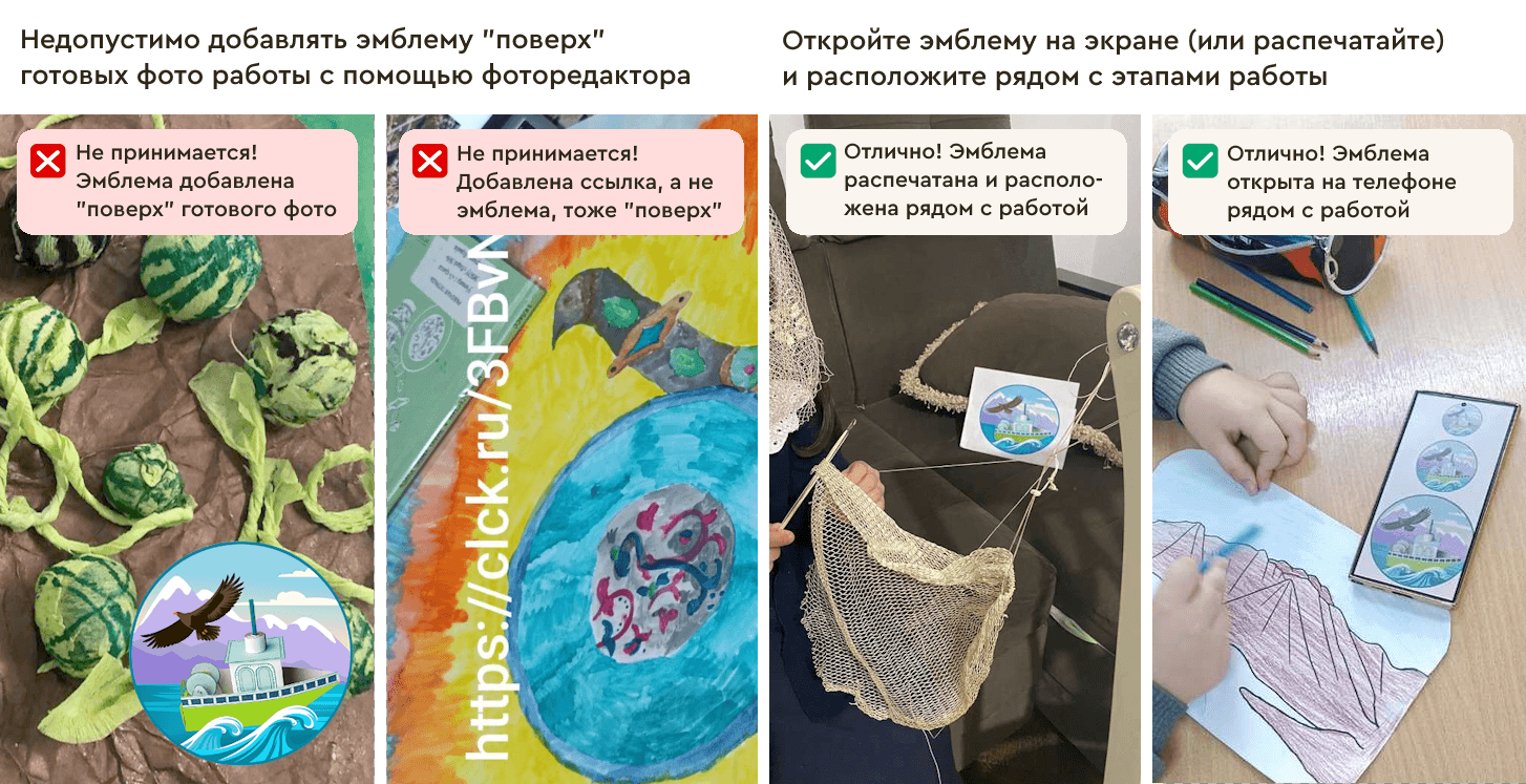 Если нет возможности распечатать эмблему допускается фотографировать работу на фоне эмблемы, открытой на экране монитора компьютера, планшета, телефона. Недопустимо, чтобы эмблема конкурса была добавлена поверх готовых фотографий с помощью фоторедактора. Что такое эмблема и почему она обязательно должна быть на фото описано в разделе «Эмблема конкурса».