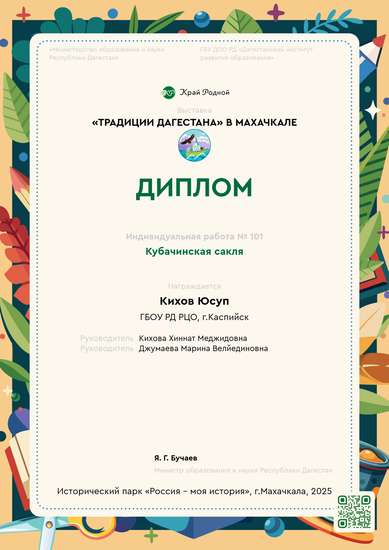 Кубачинская сакля - это маленькая версия домов в моем родном селе. В комнате камин, а на стене обязательно висят старинные тарелки, которые у нас передаются по наследству, стоят кувшины. В нашей работе можно увидеть элементы народных художественных промыслов - златокузнецов (кольчужников). Саму саклю мы собирали из картона, крепили на него осколки горного камня. Также использовали в отделке глину, дерево, акриловые краски, фольгу. В данном макете вы можете увидеть горца, в бурке и папахе. И кубачинку в традиционном наряде , платье (калхана) и платок (каз). Проект юного кубачинца, который может перерасти в талантливого мастера! Подытожить, хотелось словами моего прадедушки Ахмедова Мажида Ахмедовича: «Кто не знает Кубачи? Он прославил Дагестан. Благодарны Кубачинцам, Люди многих дальних стран...»