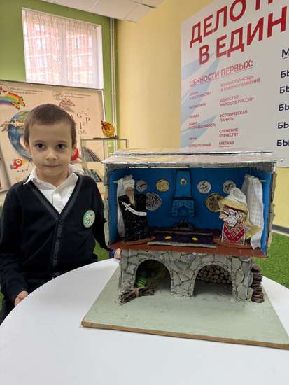Готовая работаКубачинская сакля - это маленькая версия домов в моем родном селе. В комнате камин, а на стене обязательно висят старинные тарелки, которые у нас передаются по наследству, стоят кувшины. В нашей работе можно увидеть элементы народных художественных промыслов - златокузнецов (кольчужников). Саму саклю мы собирали из картона, крепили на него осколки горного камня. Также использовали в отделке глину, дерево, акриловые краски, фольгу. В данном макете вы можете увидеть горца в бурке и папахе. И кубачинку в традиционном наряде, платье (калхана) и платок (каз).