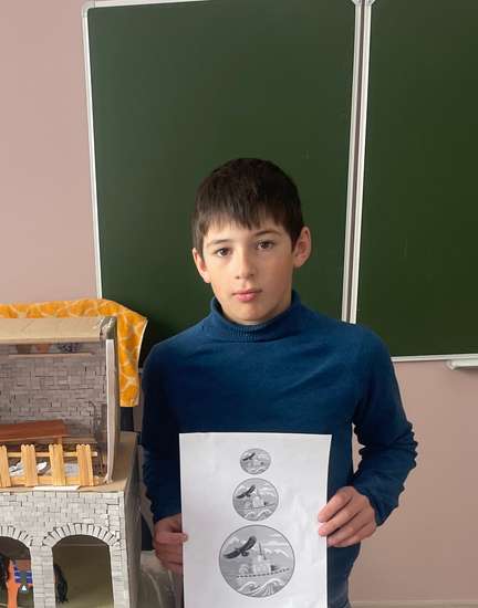 Для основания дома были взяты 2 коробки , после чего мы оформили саму саклю , в коробках были вырезаны 4 арки под старинный стиль далее вручную нарисовали и раскрасили персонажей и сделали люльку и мешки. Из бумаги также былы сделаны телега и лошадь. Амбары на нижнем этаже также сделаны из картона.