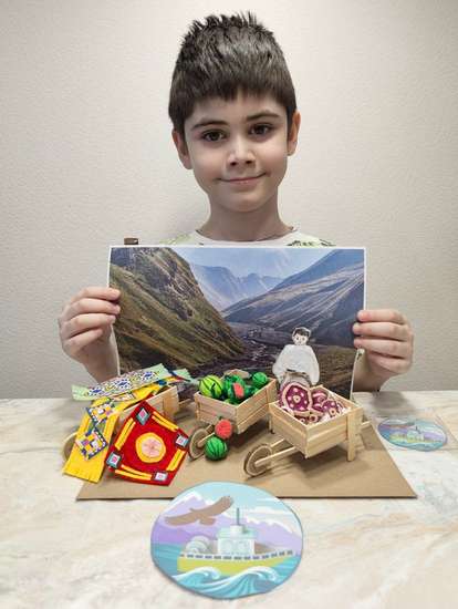 Меня зовут Максим. Мне 8 лет. Я учусь во 2 "В" классе ГБОУ Школа 338, Москва. В своей работе я передал богатые дары Дагестана. Ковры, арбузы, мунукульская насечка на посуде. Мальчик с дарами в арбе в манасе. Я узнал , что рынок - манас, телега - арба, мункульская насечка для узоров на посуде.
