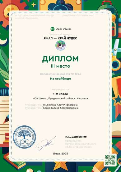 Готовая работаКоллективный проект "На стойбище" Выполнили обучающиеся 1-2 классов МОУ Школа с. Катравож Приуральского района. Руководители: Пилипянко Алсу Рифкатовна, Бойко Галина Александровна.