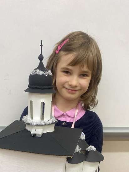 Сначала Настя познакомилась с удивительной историей храма, посетила его, также музей архитектуры, продумала план работы над макетом. Приготовила необходимые материалы: бумага, картон, клей, краски, кисти, синтепон, елочная игрушка-шар, светодиодная гирлянда, клеевой пистолет, искуственный снег.