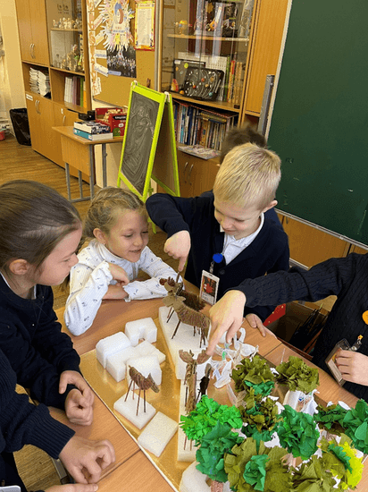 Коллективная работа выполнена учащимися 2 класса. Работа над проектов проводилась на занятиях внеурочной деятельности "Моя Москва, горжусь тобой!" Холм изготовлен из строительной пены, раскрашен и установлен на устойчивую поверхность. Далее с помощью шаблонов, картона и ниток были изготовлены лоси. Работа проводилась в парах. Сосны выполнены с помощью шаблонов, бумаги и шпажек.