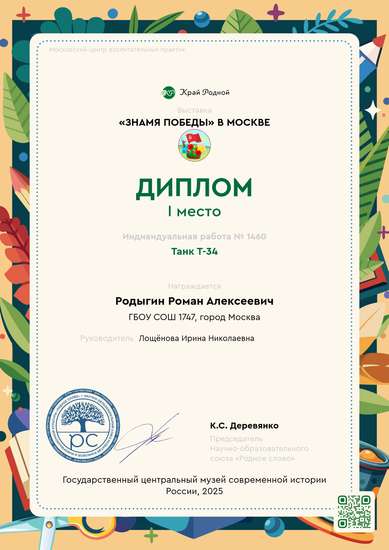 Данная работа изготовлялась в течении нескольких недель, постепенно, этап за этапом. Работа посвящена танку-символу победы в Великой Отечественной войне 1941-1945гг. и участию в ней прадедушки ученика (автора работы), который был танкистом. Были изучены фотографии и исторические данные о данном танке. Работа представляет из себя макет мемориала, с использованием различных техник и материалов.
