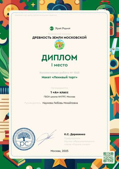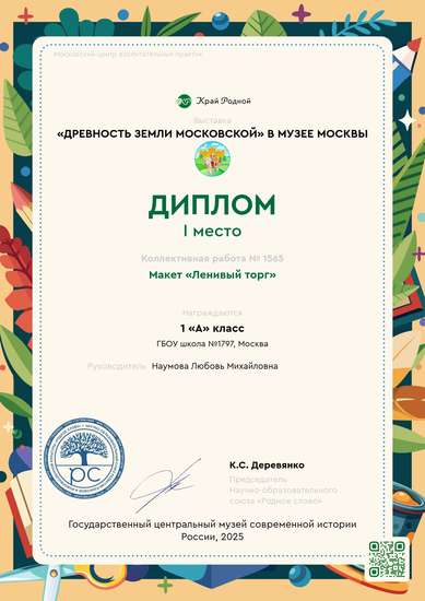 Проектная группа учащихся 1 «А» класса, состоящая из 9 человек, представляет вашему вниманию макет «Ленивый торг». На макете воспроизведена улица Ленивка с расположившимся на ней Ленивым торгом. Погрузитесь в историю, разглядывая атрибуты торговой улочки прошлых столетий. Обязательно обратите внимание на Всехвятский каменный мост через Москву-реку, соединивший улицу Ленивку с Замоскворечьем, именно он стал первым каменным мостом в городе, а за красоту его называли "восьмым чудом света". Интересные факты: Улица Ленивка расположена в центре Москвы, недалеко от Кремля. Ее длина - всего около 160 метров. Как таковых достопримечательностей на улице нет, но исторически она интересна существовавшим ранее Ленивым торгом. Именно торговля способствовала развитию и росту города, укреплению связей Москвы с другими городами. Существуют две версии происхождения названия: - по краю улицы проходил овраг с медленной рекой Ленивкой, впадающей в Москву – реку; - на улице располагался оживленный рынок «Ленивый торжок». «Ленивый» в старорусском языке означает, что на рынке не устанавливали ни ларьки, ни столы для торговли. Товар продавали с телег.
