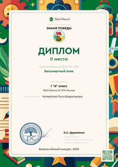 Бессмертный полк. Каждый год наша страна отмечает огромнейший праздник - день Великой Победы. По улицам Москвы проходит Бессмертный полк, в память о наших героях. Ребята 1 А класса выполнили эту работу, используя заготовки - развёртки домов, чертежа дороги и подручных средств, построили фрагмент улицы. Ребята показали в своей работе людей, шествующих по улице с портретами в руках, которые помнят и гордятся своими близкими.
