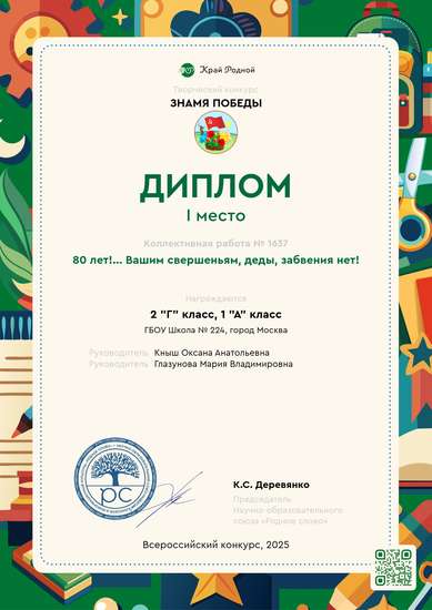 Наша работа состоит из двух частей. Левая половина - это время Великой Отечественной войны, день штурма Рейхстага и водружения над ним флага 150-й стрелковой дивизии, ставшего впоследствии Знаменем Победы. Правая половина - это наши дни: у Вечного огня на могиле Неизвестного солдата у стен Московского Кремля в Александровском саду действует пост почетного караула, здесь же возложены красные гвоздики - символ Победы, расцвели душистые яблони и пышные кусты сирени - всё готово к празднованию 80-летия Победы. В центре работы, между прошлым и настоящим, - стелла с журавлями, словно напоминание о погибших воинах, "...солдаты, с кровавых не пришедшие полей, не в землю эту полегли когда-то, а превратились в белых журавлей..."