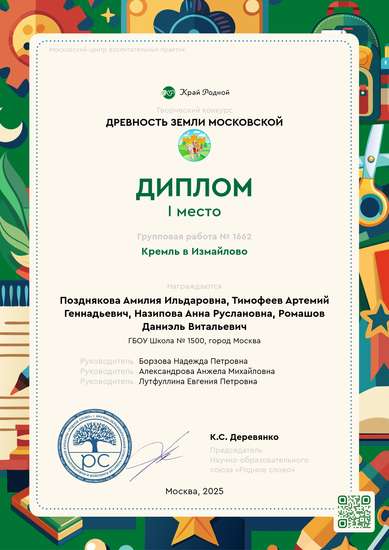 В исторических документах первое упоминание о селе Измайлово датировано еще в средние века. Эта местность являлась дворянским имением бояр Измайловых. В XVII веке Измайлово было резиденцией царской династии. На насыпном острове посреди искусственного Серебряно-Виноградного пруда, которым ныне завершается Измайловский парк со стороны комплекса, высилась усадьба Романовых. Идея создать новый культурно-развлекательный комплекс в восточной окраине столицы зародилась в конце 90-х годов XX века. Сегодня на исторической знаковой местности снова вздымаются ввысь, украшенные цветными плитками и узорами, купола и башни древнего городка. Перед тем как приступить к творческой работе ребята рассмотрели много иллюстраций о Кремле в Измайлово. Постепенно у ребят появилось представление своего макета Кремля на востоке нашей столицы.