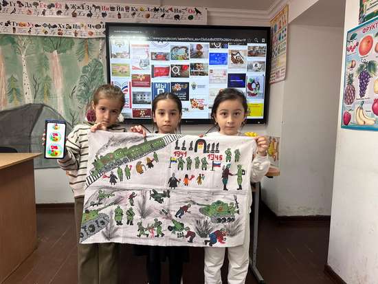 Работа посвящена битве под Москвой. Дети нарисовали простым карандашом рисунок на ткань, на котором было изображено победа нашей страны. С Днем Победы! В этот день мы вспоминаем все. Война - злодейка и воровка, горькие слезы, смерть, разлука. Она забрала много жизней людей, которые защищали всех нас, Родину. Наши защитники не жалея себя погибали от вражеских пуль. Мы точно знаем, что такое война, потому что наши деды и прадеды были на войне и рассказывали нам, как испытали ужасные мучения, но они выстояли и победили. Из-за войны множество детей остались сиротами, почти каждая семья понесла потери родственников. Война лишила их детства, лишила верных матерей, их отцов. В год 80-летия Великой Победы мы склоняем головы перед павшими в этой войне. Мы помним и гордимся!!! Многие из них не вернулись домой, геройские погибли, но они живи в наших сердцах. Рисуя работу мы хотим выразить большую благодарность всем ветеранам и защитникам Родины. Спасибо Вам за нашу счастливую жизнь.