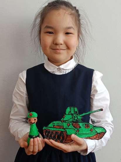 Композиция «Оружием Победы защищали мир» выполнена Дилярой с использованием технологии 3D-моделирования и изготовлена вручную с помощью 3D-ручки на занятиях творческого объединения «Основы 3D-моделирования». Центральная идея композиции заключается в воссоздании образов символов победы Советского Союза в Великой Отечественной войне — знаменитого танка Т-34 и героя-победителя, олицетворяющих мужество, стойкость и несгибаемую волю советских солдат. Работа сочетает плоскостное изображение легендарного танка с изящной трёхмерной фигуркой солдата, символизируя связь между силой оружия и отвагой защитников Родины.