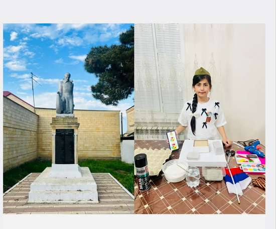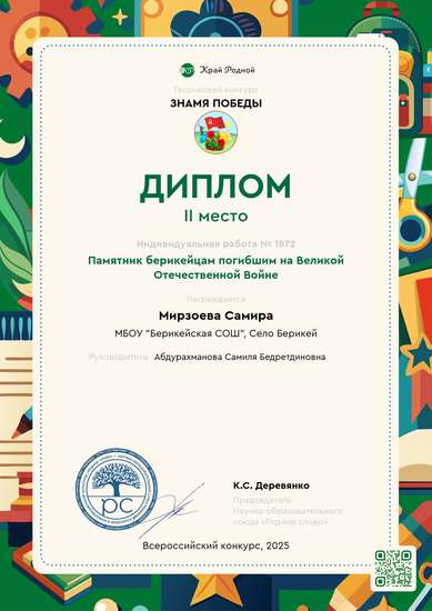 Работа представляет собой уменьшенную копию памятника жителям села Берикей павшим на полях сражений Великой Отечественной Войны. Работу выполнила ученица 4"а" класса МБОУ "Берикейская СОШ" Дербентского района Республики Дагестан Мирзоева Самира под руководством классного руководителя Абдурахмановой Самили Бедретдиновны. Памятник стоит в центре села Берикей рядом со зданием сельской администрации. На постаменте висит табличка с фамилиями погибших берикейцев.