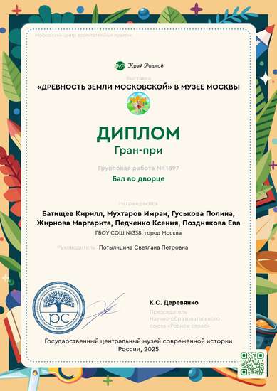 Проект уникален и изящно исполнен. Герои в своих нарядах вернули нас в эпоху 19 века. Прекрасные кавалеры, дамы долго ждали своего часа и вот он наступил. Начинается бал! Великолепно. Через такие уникальные проекты дети учатся видеть красоту и атмосферу изысканного бала. Обогащают свой интеллект , словарный запас и нравственные качества. Ведь на балу принято было соблюдать правила этикета. Это просто шедеврально!!! Выше всех похвал!!! Дети - вы большие молодцы! Желаю только победы!!! Иначе и быть не может.