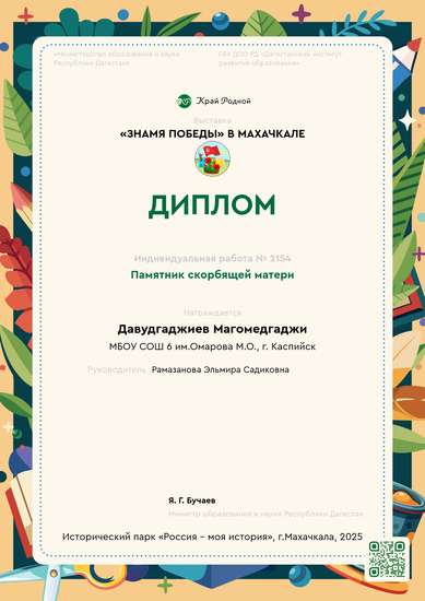 Памятник скорбящей матери - патриотическая поделка, которая развивает творческие навыки и помогает сохранить память о важных исторических событиях. Обелиск был установлен в 1965 году в г. Каспийск. Посвящён всем, кто погиб в годы Второй Мировой войны. Сам памятник скорбящей матери выполнен из полимерной глины. Такой метод создания памятника обеспечивает необходимую прочность и устойчивость конструкций.