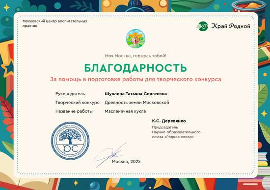 Масленичную куклу делали с целью символизма проводов зимы и встречи весны. Она была обязательным атрибутом этого праздника, так как являлась символом злой и холодной Зимы. Старая, отслужившая кукла, которая шла на костёр, считалась, что вобрала в себя все несчастья и обиды. Считалось, что вместе с огнём она очистится: «Старое сжигается, новое обретается». Для создания каркаса мы использовали доски и подставку. Форму тела и голову создали с помощью синтепона. Глаза, губы вырезали из фетра и приклеили горячим клеем. Рубашку, юбку и фартук помогали шить родители. Цветы для украшения наряда делали дети. Блины раскрашивали гуашью. Считалось, что кукла, сделанная своими руками, будет иметь большую силу, ведь в её создание мастер вкладывал часть своей души