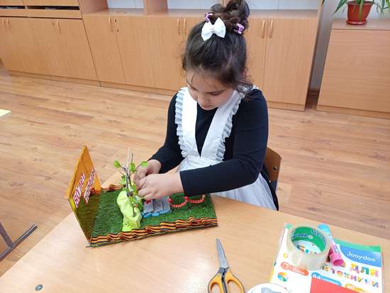 В ходе работы мы использовали : кусок красной ткани , красную ленту , картон , клей , пластмлин . И еще мы использовали ветки из деревьев . " Родина - Мать зовет !" по высоте занимает 17 сантиметров . В ходе работы над работой строго соблюдали правила безапосности . Было интересно проводить эту работу