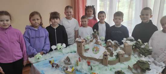 На макете представлен зимний пейзаж на Боровицком холме в Древней Москве. В работе башни деревянного Кремля, по берегам замерзшей Москвы-реки - деревянные постройки. По льду передвигаются сани, запряженные нарядными лошадьми. На холме гуляют лоси. Коллективная работа учеников из 1 "К" класса ГБОУ Школы 924 совместно с родителями. Классный руководитель: Ушкова Маргарита Анатольевна.