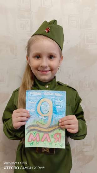 Поздравительная открытка С Днем Победы. Титульная сторона: на фоне голубого неба,которое символизирует мир и спокойствие изображена надпись "9 мая,под ней георгиевская лента символ героизма, мужества и стойкости народа, подвигов защитников Отечества в ходе военных действий.На развороте на фоне голубого неба и зеленой травы надпись с Днем Победы изображен танк и солдат -победитель в каске со звездой