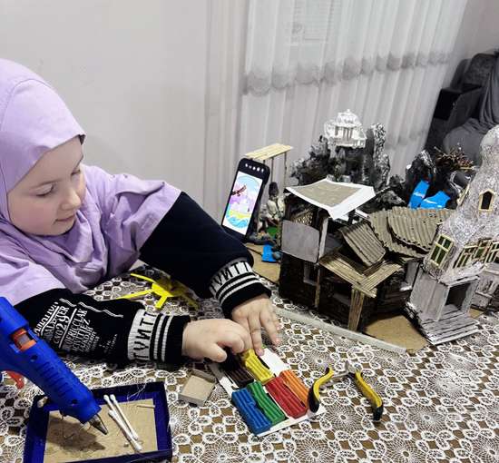 Поделка представляет собой композицию центра древнего села Ахты с основными достопримечательностями села: арочный мост, Джума - мечеть и ротонда "Шарвили". В центре села протекает река Ахты-чай, через которую бельгийский и итальянский мастера Джиорс и Дебернарди в 1915 году построили арочный мост. Также представлены старинные дома, горы и улочки, а так же годекан с аксакалами у родника.
