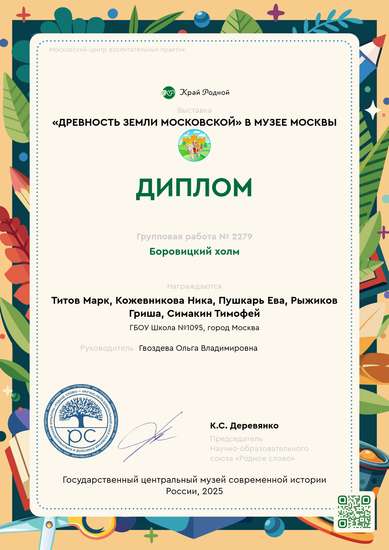 Ученики 3 «Л» класса ГБОУ 1095, под руководством родителей и классного учителя Гвоздевой О.В., своими силами воссоздали проект Боровицкого холма. Сначала проект был нарисован на бумаге и участники решали из каких материалов будут делать реку, дома, холм и др. Изучали рисунки и зарисовки того времени. Очень ответственно подошли к созданию деталей. Дети с интересом участвовали и изучали историю Москвы. Это же надо, 1156 год — год появления на Боровицком холме первого деревянного Кремля по приказу московского князя Юрия Долгорукого. И именно на Боровицком холме возникла Древняя Москва. Замечательный проект, который сплотил ребят и родителей, и открыл удивительную историю.