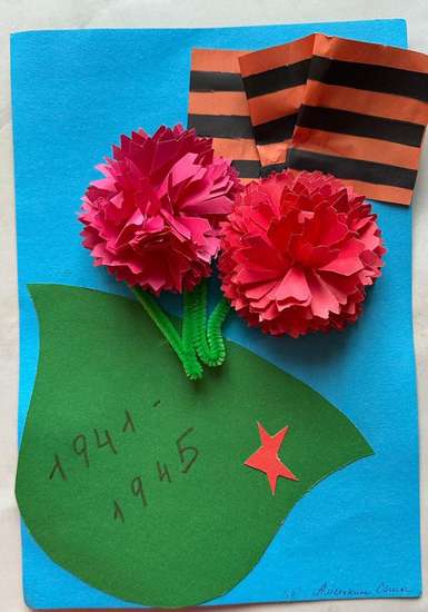 Сюжет открытки отражает скорбь и память о событиях Великой Отечественной войны 1941-1945 Солдатская каска -главный головной убор советского солдата во время Великой Отечественной войны. Она защищала голову от попадания пуль и осколков. Красная гвоздика - символизирует свободу, честь, верность и пролитую кровь. Это цветок солдата-победителя, цветок памяти и восхищения. В переводе с греческого «гвоздика» означает «божественный цветок».