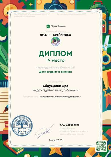 Готовая работаг.Лабытнанги, МАДОУ"Едэйко", 2 младшая группа 3 "Лисята", Абдумалик Эра, 4 года, "Дети играют в снежки" Воспитатель: Колдамасова Наталья Владимировна