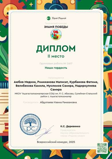 Здравствуйте! 4 б класс, Ашагасталказмалярская школа. Наша работа называется "Гордость". Почему? Мы гордимся нашими ветеранами! Низкий им поклон! Всём кто отдал жизнь за нас! Спасибо вам за мирное небо над головой, за яркое солнце, за свободу. Мы будем помнить, и никогда не забудем. Жаль, что так мало ветеранов осталось. Спасибо!