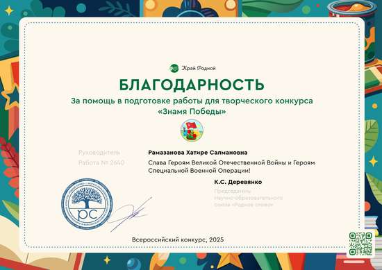 80 лет назад на нашу страну напали враги, которые хотели забрать наши земли и сделать народ своими слугами. Погибли миллионы людей, в каждой семье есть история о героях. Но люди не сдались — они встали на защиту Родины и победили! 9 мая 1945 года враг сдался, и это стало Днём Победы. Мы помним и чтим память о тех, кто подарил нам Мир. И сегодня наши храбрые и мужественные солдаты участвуют в Специальной военной операции, защищая простой народ от нацистов. Наш президент Владимир Владимирович Путин сказал, что каждый участник в Специальной военной операции - Герой! И мы верим в своих солдат и верим, что Победа будет за нами!