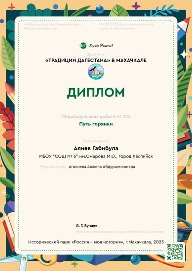 I место на конкурсе Наш орлиный ДагестанУчастник выставки «Традиции Дагестана» в Махачкале