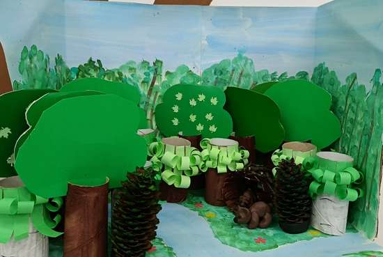 Материалы: цветная бумага, клей, краски, картон, втулки, природный материал (шишки, веточки), пластилин, крышки