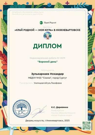 «Вороний День» – один из самых почитаемых праздников народов ханты и манси. Ворона – вестник жизни, покровительница женщин и детей, первая птица, которая прилетает на Север. Вороний день - это замечательный весенний праздник, Ворна хатл (Вороний день), когда детям дарят подарки, друг другу желают здоровья, счастья и благополучия. На рисунке я изобразила, как дети рады, что на Север вернулась Ворона, значит, скоро будет тепло.