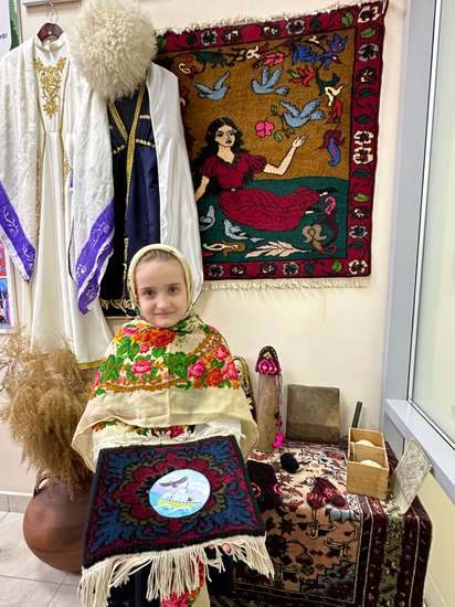 На конкурсе «Наш орлиный Дагестан» мы решили принять участие в номинации «Внимательно вглядитесь в мой узор». Данная тематика была выбрана после посещения музея в городе Дербенте, когда ребенок гулял с семьей. Здесь получило широкое распространение выращивание естественного красителя — марены. Дагестанские ковры ручной работы носят национальный характер и высоко ценятся, как семейные реликвии. Они отличаются высокой прочностью, долговечностью, возможностью изначального выбора цветовой гаммы, плотности, высоты ворса, неповторимостью цветовой гаммы и композиционных решений, многообразием рисунков и размеров. Наш ковер выполнен в традиционной цветовой гамме с использованием шерстяной нитки. Схема была взята у одной из жительниц города Дербента. Работа также выполнялась на станке в творческой мастерской нашей школы, использовали ткацкий нож, ножницы, специальный гребешок для прессовки законченного ряда, раги прибивали ряд после окончания работы.