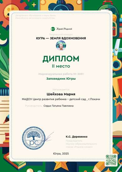 ХМАО - Югра - красивое место на севере России. Природа здесь прекрасна и неповторима. Ханты и Манси с особым почитанием относятся к природе родного края. Большую часть территории округа занимают озёра, реки, болота и хвойные леса. Тайга - это зеленый дом для огромного количества живых существ. Каждое дерево у северных народов имеет своё значение, а реки и озёра считаются священными. Животные тайги по-своему интересны и удивительны. И мы - жители Югры, должны сделать всё для сохранения первозданной красоты заповедных зон округа. Наша работа представляет собой макет заповедной зоны, в которой присутствуют животные таёжных лесов, в том числе представители исчезающих видов, занесённых в Красную книгу Югры.