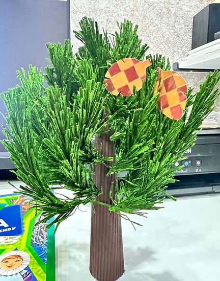Готовая работаПоделка «Дух кедра» символизирует силу и красоту кедра. В работе используются темно зеленая гофрированная бумага для передачи текстуры и цвета, картон — основа. Инструменты: ножницы, клей, линейка, карандаш,проволока. Процесс развивает аккуратность и творческие навыки, помогает почувствовать связь с природой.