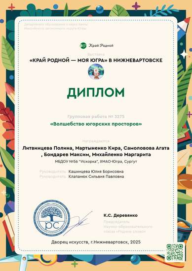 Воспитанники группы компенсирующей направленности (ТНР) старшего дошкольного возраста (5 – 6 лет) под руководством воспитателей изготовили мини-макет «Волшебство югорских просторов». Основной целью работы было показать природные богатства югорского края, используя учебные комплекты для дошкольных образовательных организаций «Моя Югра. Край, в котором я живу».