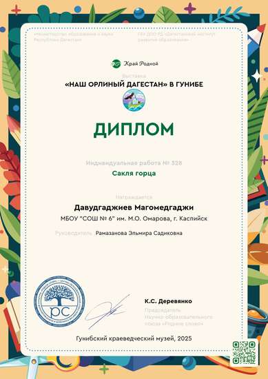 I место на конкурсе Наш орлиный ДагестанУчастник выставки «Наш орлиный Дагестан» в Гунибе