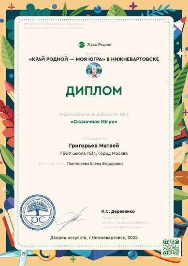 I место на конкурсе Югра — земля вдохновенияУчастник выставки «Край родной — моя Югра» в Нижневартовске