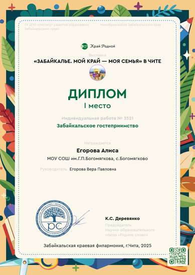 Мы создали макет как живут люди в Забайкалье,а именно быт бурятов:Дацан,буузы,священные деревья с ленточками и леса с багульником.Здесь видны и традиции этого народа.Я,как родитель предложила,что у нас будет на макете,помогла нарисовать фон,сделала куклу-буряточку с буузами,остальное приклеивала,раскрашивала Алиса,так как посещает художественный кружок и это занятие ей очень нравится.Мы посещали священные бурятские места всей семьёй,нам это понравилось,поэтому выбрали именно эту номинацию.