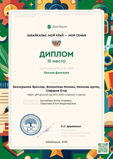Данная работа выполнялась совместно с педагогами и воспитанниками, педагог дал идею для творческой работы, приготовил подобранный материал, педагоги сделали основу леса из ткани, дети слепили животных которые обитаю в нашем Забайкальском крае. Мы с детьми представили как мы с ними попали в сказочный лес, где высокие деревья шепчутся с ветром, а под ногами шуршат золотые листья и мягкий мох. Это Забайкальский лес- полный тайн, красок и добрых зверят, воспитанники слепили лесных зверей из пластилина, а также мы поговорили о каждом звере, где живет, чем питаются. В нашем лесу живут пушистая лиса, лесной богатырь-лось, хитрый ёжик, и другие обитатели леса. А так же в лесу можно услышать - Шепот листвы: ш-ш-ш.... - Пение птиц: чик-чирик, ку-ку! (это кукушка считает годы) - Ветер играет на соснах, как на скрипке: у-у-у-...