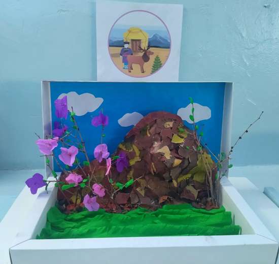 Способом папье маше сделали сопку, которую прикрепили к коробке, на одной части сделали небо с облаками из цветной бумаги, на второй из зеленой гофрированной бумаги наклеили траву, после чего композицию украсили цветущим багульником.