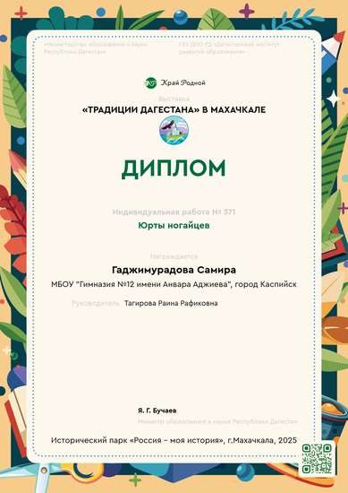 Мы с Самирой решили принять участие в Республиканском творческом конкурсе "Наш орлиный Дагестан". Изучив разные темы, мы решили выбрать номинацию "Всем людям хватит места на земле". Самире очень понравился проект "Ногайская степь". Мы решили заглянуть в гости к ногайской семье. Детально изобразили юрту ногайцев, их костюмы, а также жизнь и быт этого народа. Ногайцы держали домашних животных, из шерсти которых женщины делали нитки для шитья одежды и валяли войлок для ковров-кийгиз. Они хранили в юртах много матрасов и подушек из шерсти. Мы тоже решили сшить и поместить в нашу юрту матрасы, подушки и маленький ковер. Самое красивое время в ногайской степи-весна.Всё вокруг расцветает. Мы решили показать в нашем проекте именно это время года. Ногайская семья трудится в своём дворе. Женщина и мужчина занимаются домашними делами, а на костре готовится вкусный плов. В углу двора стоит очень красивый колодец, а в другом углу ногайская семья построила качели. Домашние животные следуют за своим хозяином, который наводит порядок в своем дворе. Каждую деталь в проектной работе Самира готовила с радостью и с большим уважением к ногайскому народу .