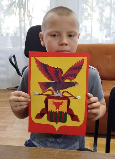 На уроках окружающего мира мы познакомились с гербом Забайкальского края. Изучили, что обозначают цвета и символы герба. На конкурс представили аппликацию "Герб Забайкальского края". Некоторые детали Илья попытался изобразить объемными. Например, наконечник стрелы, клюв и когти орла обклеили фольгой, потому что в нашем края добывается серебро. Все фигуры, расположенные на гербовом щите края, символизируют дружбу народов, живущих на территории Забайкальского края. При исполнении герба Забайкальского края применены следующие цвета, которые обозначают: — Красный — символ мужества и неустрашимости. — Зелень — символ надежды, радости и изобилия. — Золото — символ богатства и справедливости. — Серебро — символ добра и независимости.