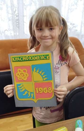 Мы живем во втором по величине городе Забайкальского края. В атомной столице. В нашем городе добывают нужную для нашей атомной промышленности руду - уран. Поэтому на нашем гербе стоит знак атома. Наш город очень солнечный, ведь солнечных дней у нас больше, чем на юге. Поэтому на гербе изображено солнце. На нашем гербе присутствуют такие цвета как: Зеленый цвет – символизирует расположение района на государственной границе, плодородную приаргунскую степь. Желтый цвет – символизирует основное направление деятельности сельского хозяйства района – производство зерна. Голубой цвет – символизирует прозрачное, ясное небо и реку Аргунь. Красный цвет – символизирует деятельность градообразующего предприятия ОАО ППГХО – добычу урановой руды. 1968 год – год образования г.Краснокаменска. У Насти получилась, не только замечательная поделка, но она и узнала о значении символов, изображенных на гербе своего города.