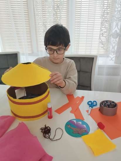 Домик — уютный, как в ауле или на горе. Вот простые слова для рисунка/рассказа (читай по слогам): - Дом (дом) — круглый с крышей. - Крыша (крыша) — жёлтая В начале берет картон и делаем из нее круг далее основу,берём необходимые вещи и всё поэтапно клеем, получается дом у вершины