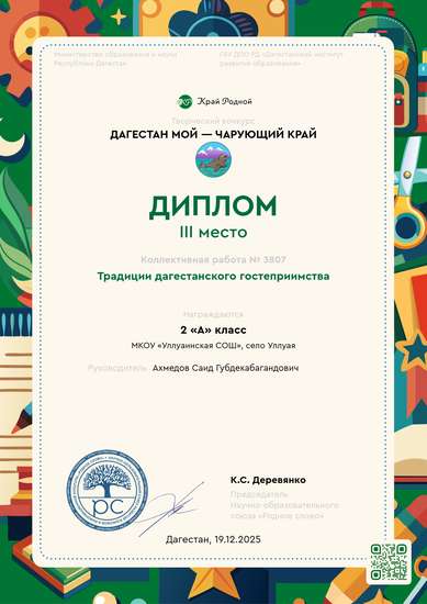 Гостеприимство считается одной из главных добродетелей человека по всему Дагестану. В устном народном творчестве, особенно в пословицах и поговорках, важность обычая гостеприимства отражается во всей своей полноте и многосторонности. Гостеприимство является одним из важнейших каналов общения представителей разных селений, обществ, народов. Обычай этот, насыщенный множеством предписаний и этических норм, имеет в Дагестане многовековую историю. Все лучшее в доме, в хозяйстве предоставлялось гостю: лучшая еда, комната, посуда, коврик, тазик и кувшин для омовения и намаза, лучшая постель. Что-либо, недостающее в хозяйстве для обслуживания гостя, хозяин без зазрения совести просил у родственников или односельчан. Наша работа включает в себя национальные блюда дагестанской кухни. Нам интересна эта тема так как нельзя забывать свои традиции и обычаи и нужно их соблюдать. Детям очень понравилась данная тема и работали с удовольствием. Дети узнали много чего нового про наши традиции и обычаи. Спасибо.