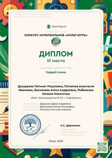 Мультфильм по мотивам сказки "Гордый олень" раскрывает историю народа Югры, их быт, традиции и культуру бережного отношения к окружающей природе. Тема привлекла тем, что можно через мультик показать национальный колорит Югры, познакомиться с уникальной культурой народов, населяющих Север. Самобытная культура коренных малочисленных народов Севера, их праздники, обычаи, обряды и традиции хранят в себе многие тайны и мудрость древнего народа, позволяют приобщиться к первозданности северной природы. Васильева Алиса, Дукуруева Петимат изготовили из пластилина человечков (семью Манси) под руководством Васильевой Ксении Николаевны. Васильева Алиса, Дукуруева Петимат, Потапова Анастасия рисовали фон для мульт-студии под руководством Рагозиной Ольги Викторовны. Рыбьякова Милана озвучила мультфильм, созданный по мотивам сказки "Гордый олень", также участвовала в создании самого мультфильма. Дядюшко Дарья Андреевна занималась монтажом мультика. https://cloud.mail.ru/public/pjNs/XPJ4QPVKs