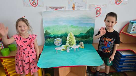 На этой фотографии дети переходят к следующему этапу работы — сборке и размещению фигурок животных на подготовленном фоне. Дети расставляют бумажные фигуры оленей , который был создан на предыдущем этапе.