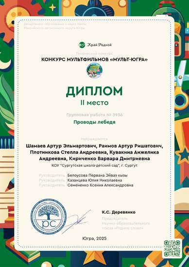 В рамках проекта приняли участие дети подготовительной группы "Ромашка" KOУ "Сургутская школа-детский сад". На первом этапе участники вместе с педагогами подготовили реквизит к мультфильму: яркие деревья, чум, собаку и глухаря, выполненные по образцу из пособия "Моя Югра. Край, в котором я живу ". Персонажа лебедя изготовили методом нейролепки, что позволило передать плавные линии и выразительность движений. Фигурки хантов также были взяты из материалов пособия "Моя Югра. Край, в котором я живу ". Кроме того из пластилина слепили грибы и ягоды, что обогатило сценографию и придало сюжету природную атмосферу. Далее дети вместе с наставниками приступили к поэтапному фотографированию сюжета: малыши помогали перемещать фигурки, внимательно наблюдали за композицией кадра, учились фиксировать кадры и работать с простыми кадрами застелем. Руководители проекта занимались монтажом и озвучиванием мультфильма, обеспечив плавное соединение кадров и создание выразительного звукового сопровождения, которое подчеркивает настроение каждой сцены. https://disk.yandex.ru/i/MBV3Q-wL09nyUw
