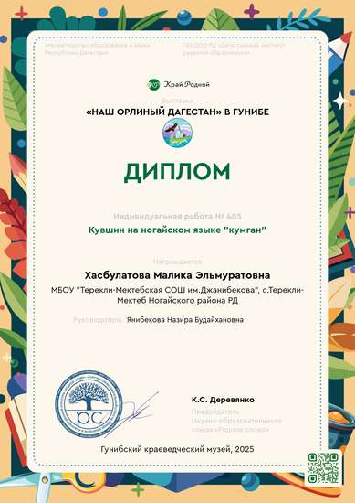 I место на конкурсе Наш орлиный ДагестанУчастник выставки «Наш орлиный Дагестан» в ГунибеУчастник выставки «Традиции Дагестана» в Махачкале