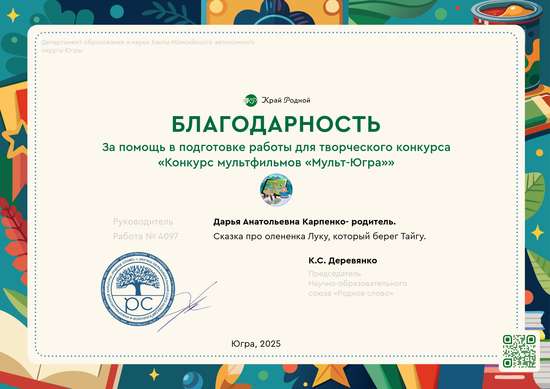 Работа предоставленная на конкурс полностью отвечает теме конкурса: "Сказочная природа Югры", так как в работе идёт описание красоты Тайги и присутствует сказочный элемент - звери представлены, как разумные существа, имеющие разнообразие эмоций и чувств, не характерных их виду, так же они разговаривают с человеком на одном понятном языке. Ребёнок отрисовал гуашью на бумаге плотностью 220г/м² 24 кадра (но на конкурс пришлось отобрать из них 21 кадр, так как регламент гласит, что всего можно отправить только 25 фото!) к сказке, автором которой выступил классный руководитель Резник Анастасия Михайловна. Родитель Карпенко Дарья Анатольевна сделала анимацию каждого кадра при помощи искусственного интеллекта Алиса, смонтировала видео в приложении InShot, в этом же приложении был наложен звук. Карпенко Агата озвучила Луку, закадровый голос и голос других персонажей - Карпенко Дарья Анатольевна (мама). Ссылка на мультик: https://ok.ru/video/10442062432820?ref=ok
